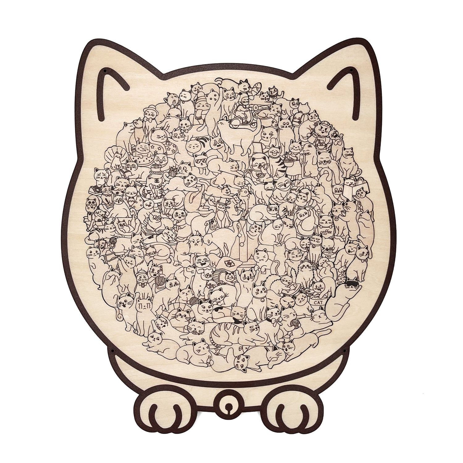 Each puzzle piece is meticulously designed, each with its own unique shape. Some resemble cat paws, while others depict cats in various poses. The finely cut edges ensure a seamless fit when pieced together. The picture is filled with cats in various poses and expressions, some lazily reclining, others playfully gazing out. The intricate details allow you to glimpse into the cats' "little world," creating a joyful exploration as you complete the puzzle.