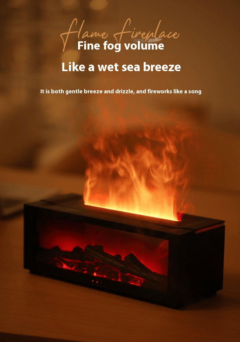The Simulation Fireplace Flame Humidifier is a uniquely designed rectangular humidifier that mimics the cozy ambiance of a real fireplace. Its front features a lightbox that simulates burning logs, creating a warm and inviting atmosphere when turned on. As mist rises from the top, it is illuminated by LED lights, producing a mesmerizing flame effect.