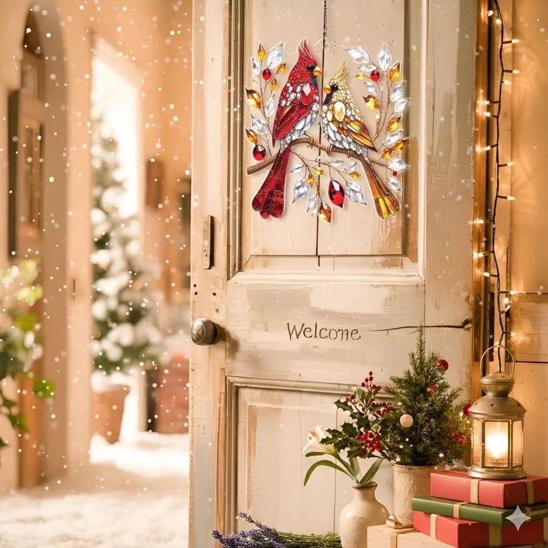 Featuring a vibrant male and a gentle female cardinal perched on frosted branches, it’s a timeless keepsake of companionship and joy.